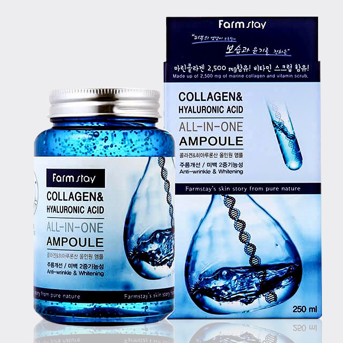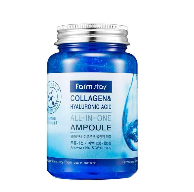 آمپول کلاژن و هیالورونیک اسید آل این وان فارم استی در اندازه فول سایز با حجم 250 میلی لیتر و ساخت کشور کره جنوبی، یک محصول جوانساز و ضد پیری است. این آمپول ترکیبی از دو ماده موثر کلاژن و هیالورونیک اسید بوده و همچنین غنی از ویتامین ها و مواد معدنی و عصاره جوجوبا می باشد. آمپول کلاژن و هیالورونیک اسید آل این وان FarmStay پوست را به خوبی آبرسانی و مرطوب می کند. این محصول به بهبود خطوط و چروک ریز پوستی کمک کرده و از ایجاد علائم پیری پوست جلوگیری می نماید.